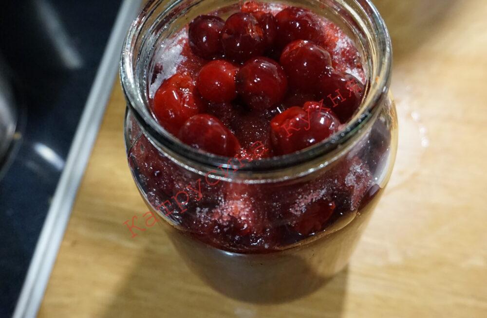 Отже, за рецептом, у чисту літрову банку накладаємо тісненько половину вишень, додаємо 2 ст.л. з гіркою цукру.
