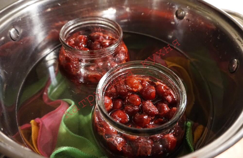 На півлітрову – даємо по столовій ложці, так само на половині. Сік, що виділився при очищенні вишень від кісточок, теж додаємо у банки. Накриваємо банки з вишнями стерильними кришками і ставимо стерилізуватися.