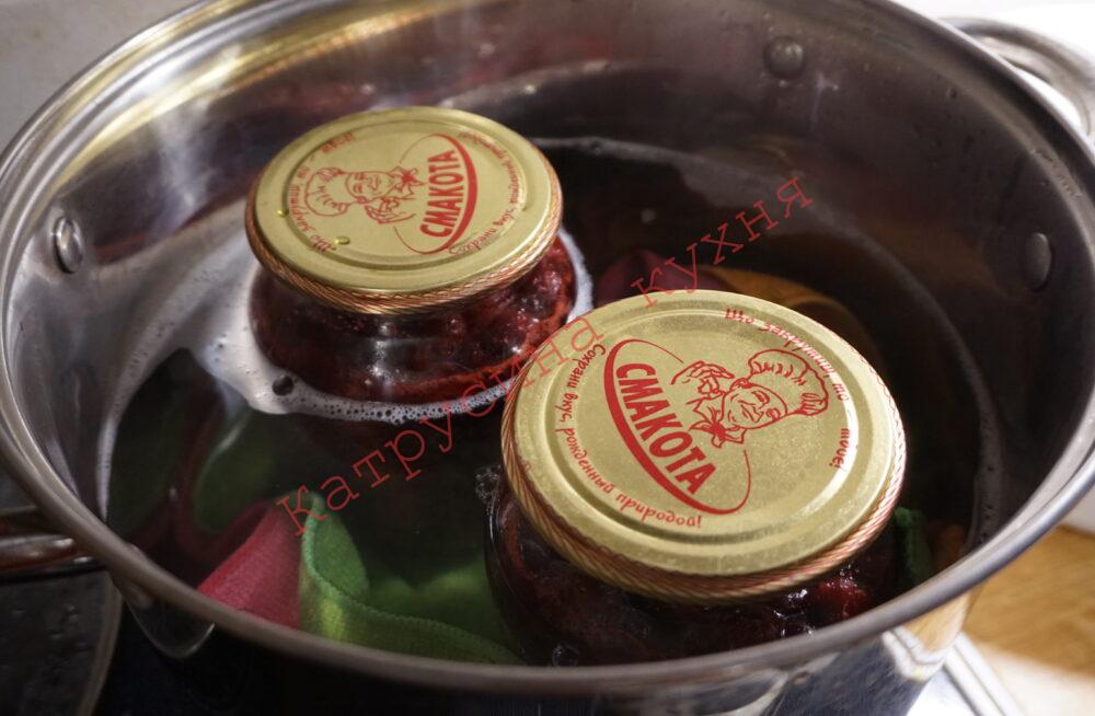 Наливаємо холодну воду до плечиків банок. Літрові банки я стерилізувала 20 хв. від закипання, півлітрові – 15 хв.